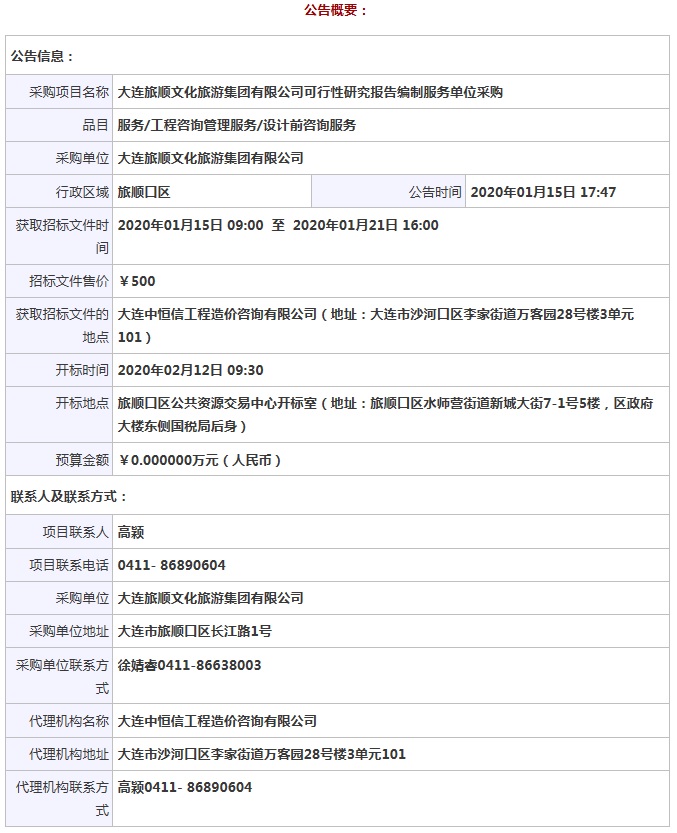 大连旅顺文化旅游集团有限公司可行性研究报告编制服务单位采购公开招标公告