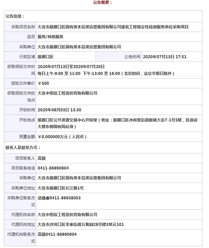 旅顺口区国有资本投资运营集团有限公司建筑工程稳定性检测服务单位采购公告